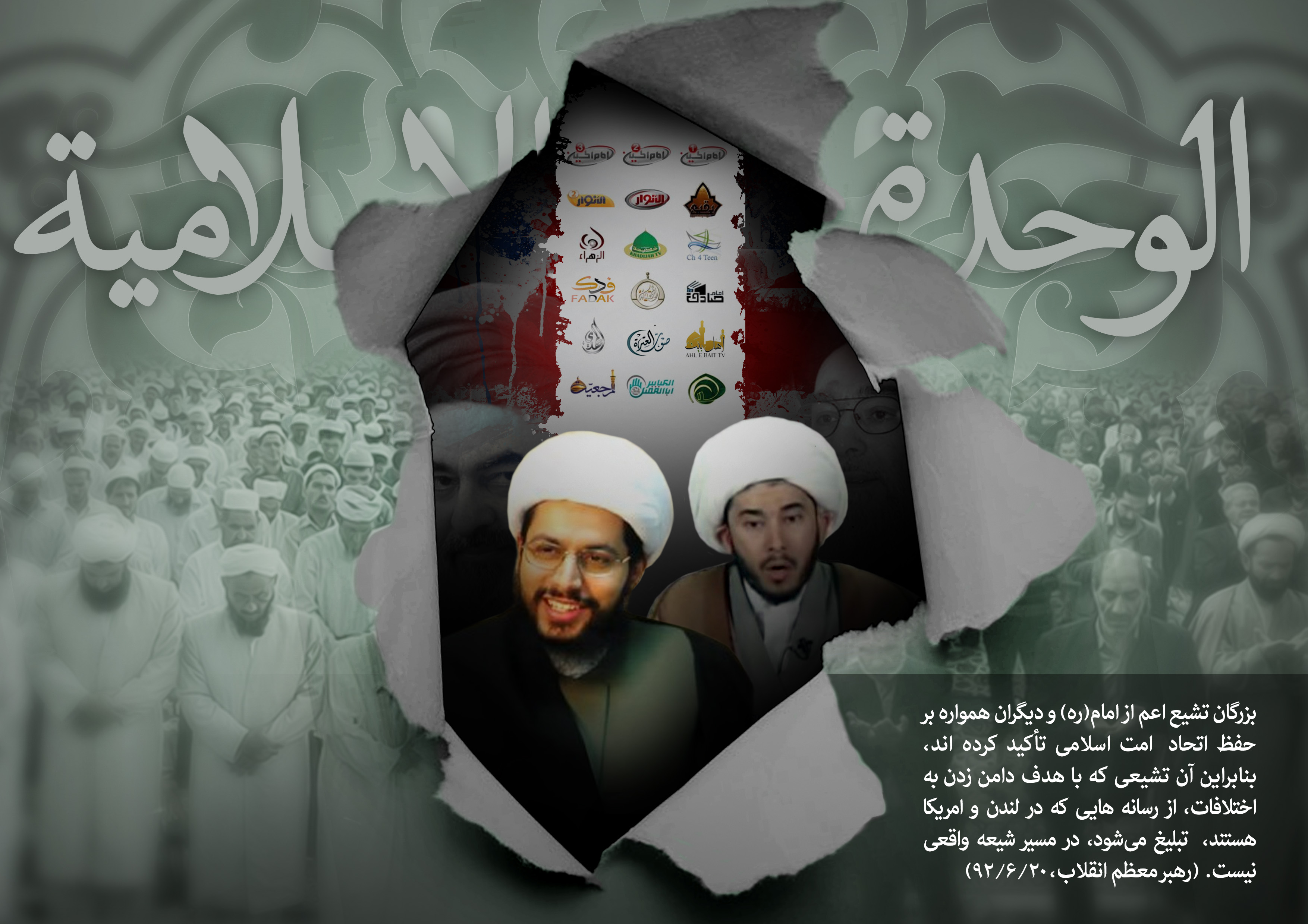 بزرگان تشیع اعم از امام(ره) و دیگران همواره بر حفظ اتحاد امت اسلامی تأکید کرده اند، بنابراین آن تشیعی که با هدف دامن زدن به اختلافات، از رسانه هایی که در لندن و امریکا هستند، تبلیغ میشود، در مسیر شیعه واقعی نیست. (امام خامنه ای، 20/6/92)